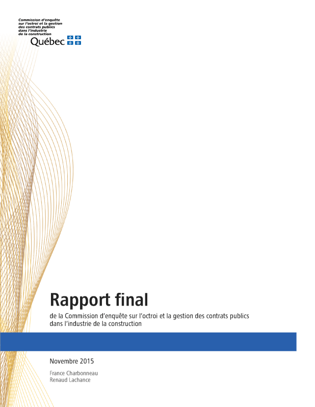 Le présent rapport tente d’apporter des solutions concrètes au gouvernement afin de lui permettre d’enrayer la collusion et la corruption dans l’attribution des contrats publics, d’empêcher l’infiltration du crime organisé dans l’industrie de la construction et de placer les élus à l’abri des pressions politiques associées au système de financement et à l’octroi de contrats. Mais ce n’est là que le premier pas d’un travail qui ne sera jamais achevé une fois pour toutes. Le rapport invite ainsi à la vigilance, une vigilance nourrie par le regard critique des citoyens, par l’éducation, la sensibilisation et l’engagement de toute une société à préserver l’intégrité de ses institutions publiques.